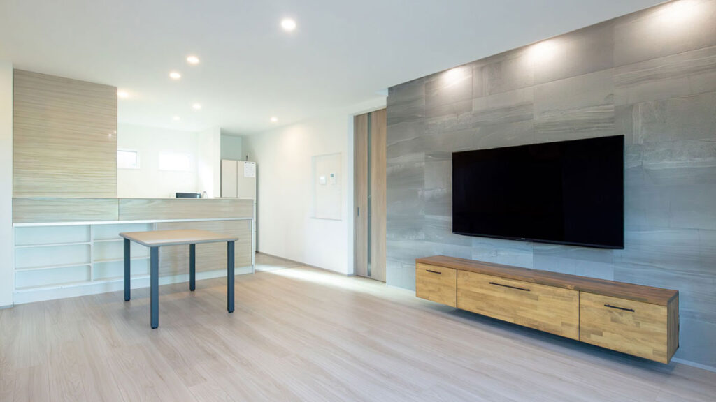 • LDKの建具は寒色系の落ち着いた空間に暖かみをプラスするYKK APさんの「ラフォレスタF:ブライトペカン色」を採用
